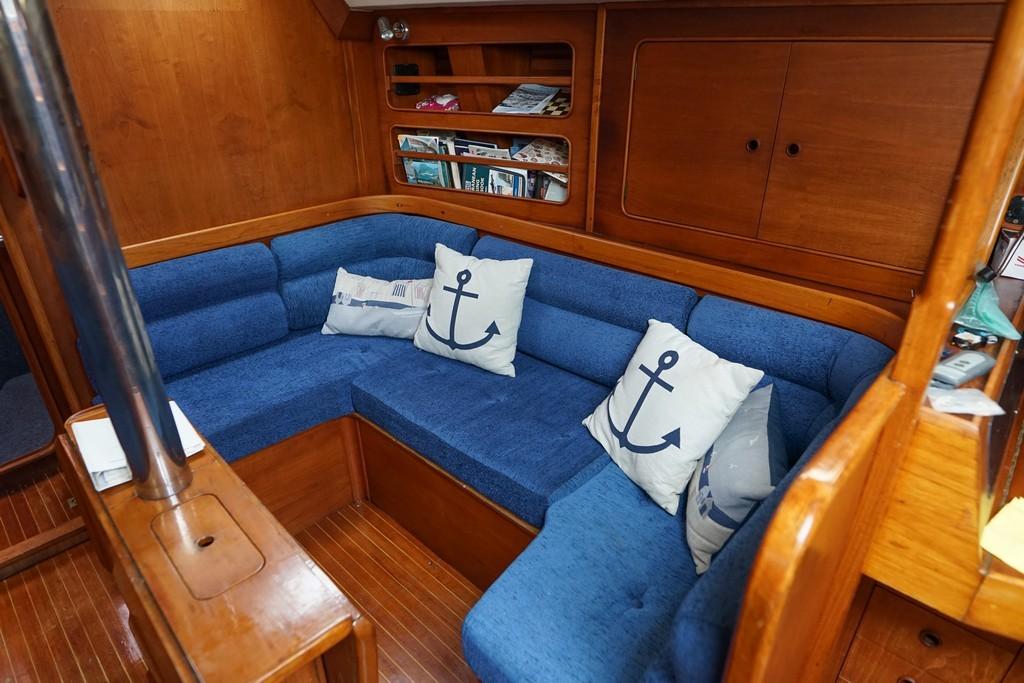 A very roomy family cruiser, the Moody 425 has excellent accommodation below all finished in teak and with dark blue upholstery.
