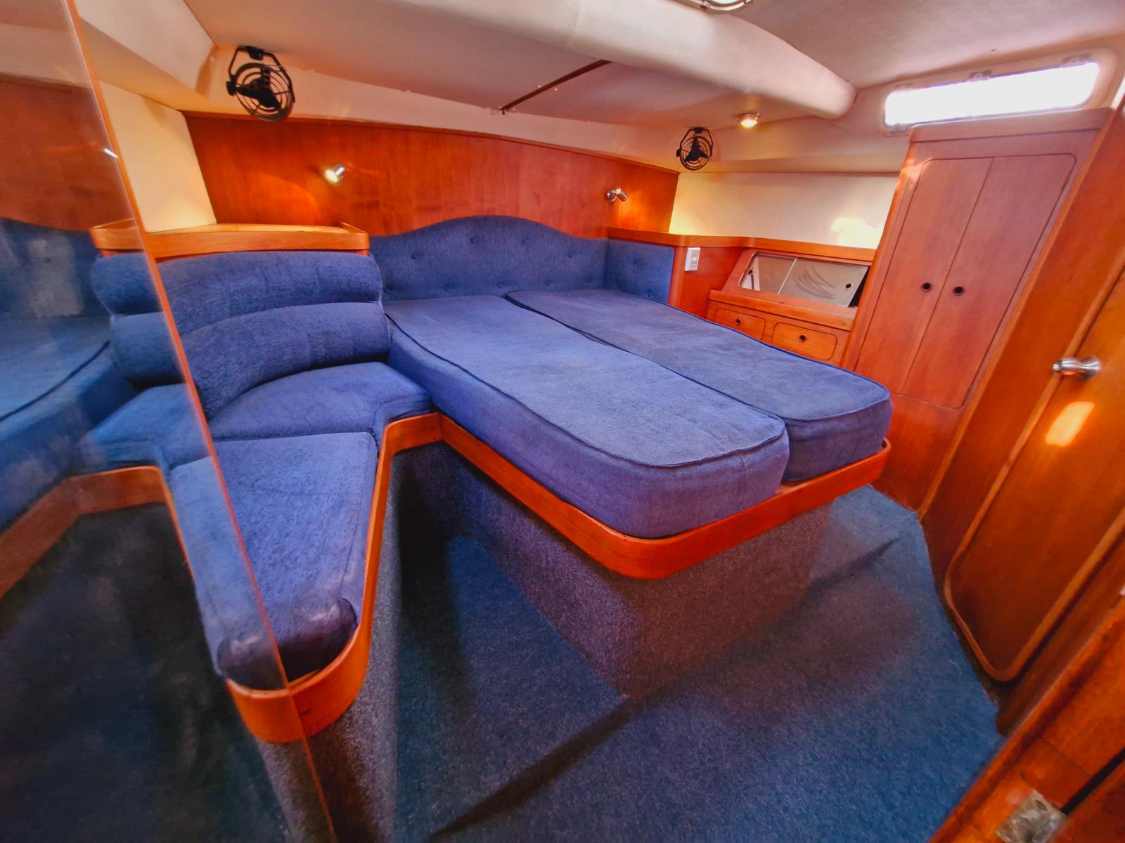 A very roomy family cruiser, the Moody 425 has excellent accommodation below all finished in teak and with dark blue upholstery.